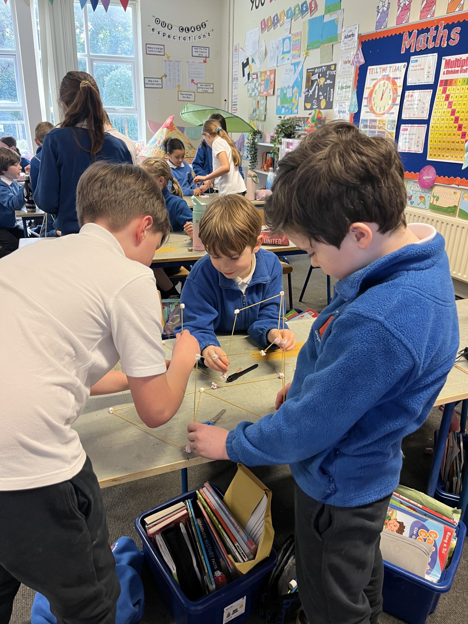3rd Ash built 3D pyramids and prisms from matchsticks and modelling clay to explore edges,