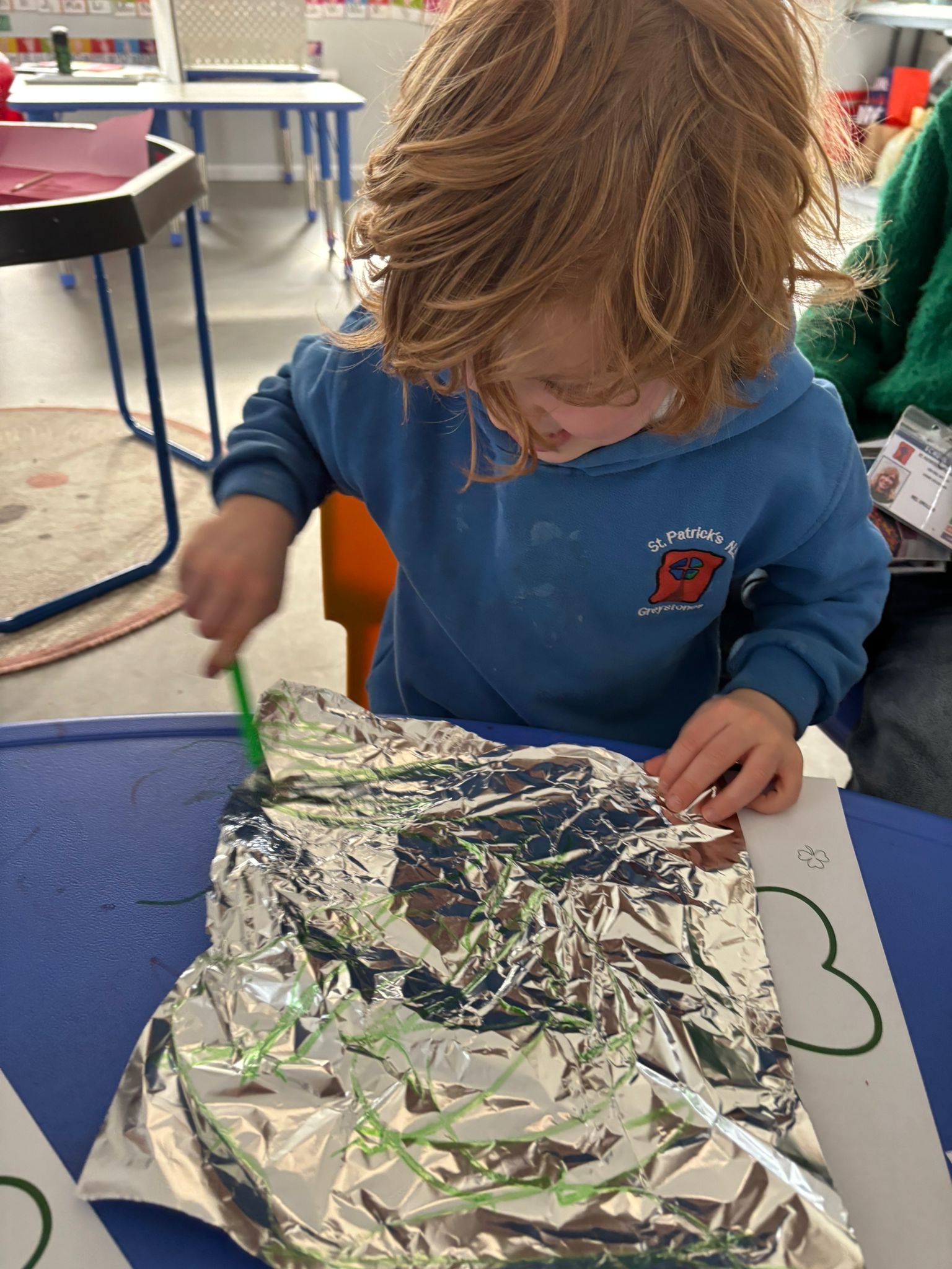 Today in Juniper we used tinfoil, markers, and water to make Shamrock print art for