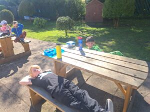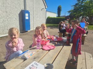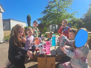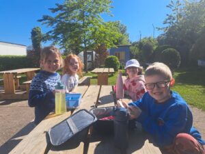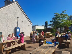Senior Infants Birch enjoyed having their lunch outside today and wearing their own clothes as part of a reward for filling up their pom pom jar.
